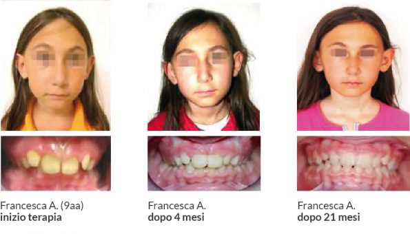 I risultati di questa terapia sono sorprendenti. In tempi molto brevi già si possono apprezzare cambiamenti a livello della bocca, del cranio, del viso e anche a livello emozionale, come nel caso della piccola Francesca A. una bimba vivace con problemi occlusali a cui il dentista voleva approcciarsi con un espansore del palato. Non convinti di questa soluzione i genitori decisero di seguire il Metodo Montorsi e già dopo pochi mesi poterono apprezzare cambiamenti a livello occlusale, del viso, ma soprattutto nell’ambito emozionale. La bimba infatti era molto più posata, serena e addirittura studiava con più piacere.